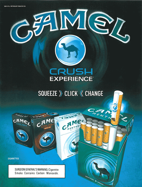 Camel ad promoting their Crush product line. Text: \"Camel Crush Experience; Squeeze, Click, Change.\"