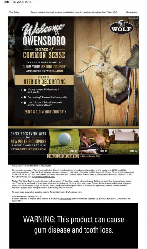 Timber Wolf email received in June 2013 promoting their Home of Common Sense sweepstakes. Email invites receiver to participate in their weekly poll for a chance to win $1,000 and receive coupons.