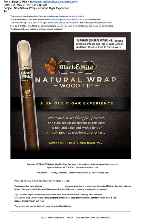 Email received in May 2013 from Black & Mild promoting their Natural Wrap Wood Tip cigar. The email describes this particular cigar that it is wrapped in Corojo leaves and contains smooth pip tobacco.