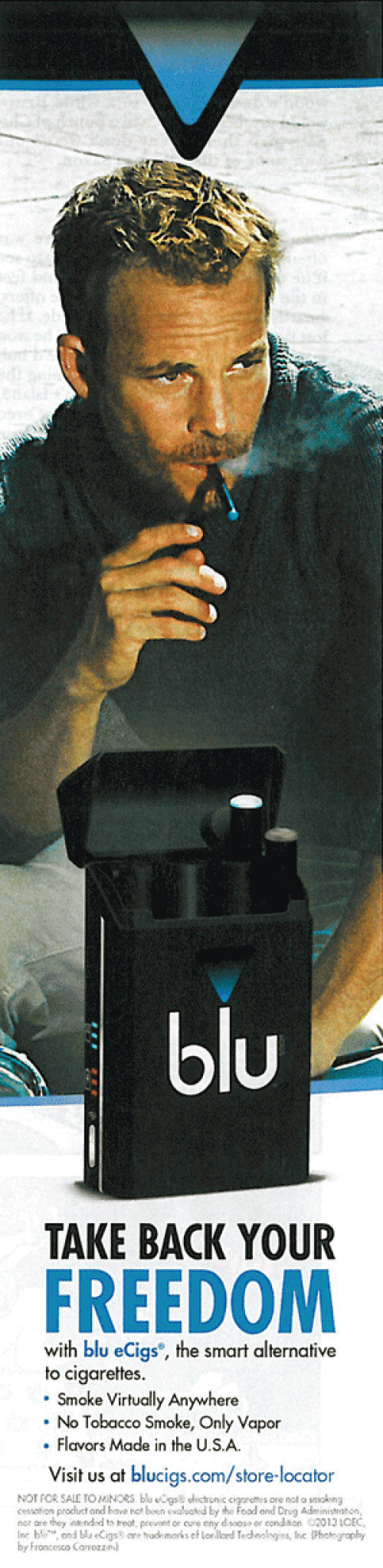 1/3 page Blu ad featuring actor Stephen Dorff using a Blu E-Cigarette, seated on a car. Text: Take back your freedom."