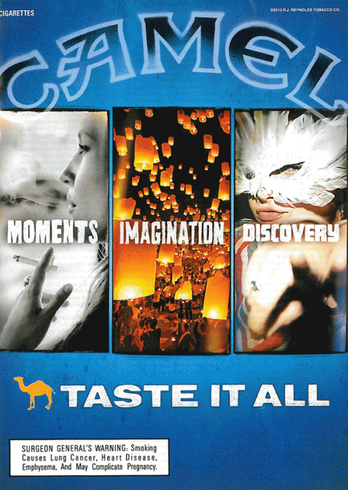 Camel ad featuring several images from its Summer 2013 ad series. Text: "Moments; Imagination; Discovery. Taste It All."