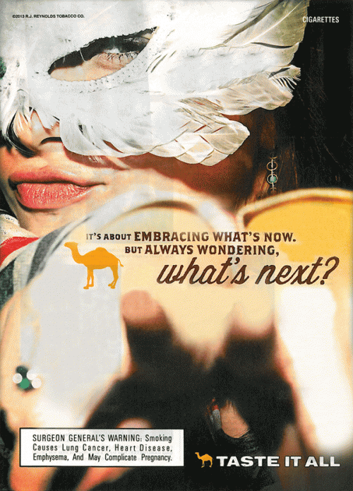 Camel ad featuring an image of what appears to be a Carnival dancer. Text: " It's about embracing what's now. But always wondering, what's next?"