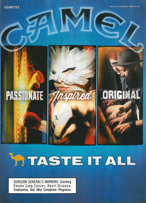Camel ad featuring several images from its Summer 2013 ad series. Text: "Passionate; Inspired; Original. Taste it all."