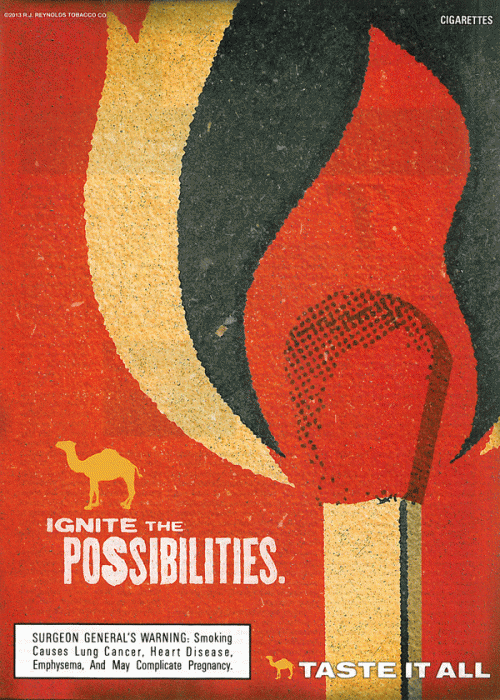 Camel ad featuring an artistic image of a lit match. Text: "Ignite the possibilities."