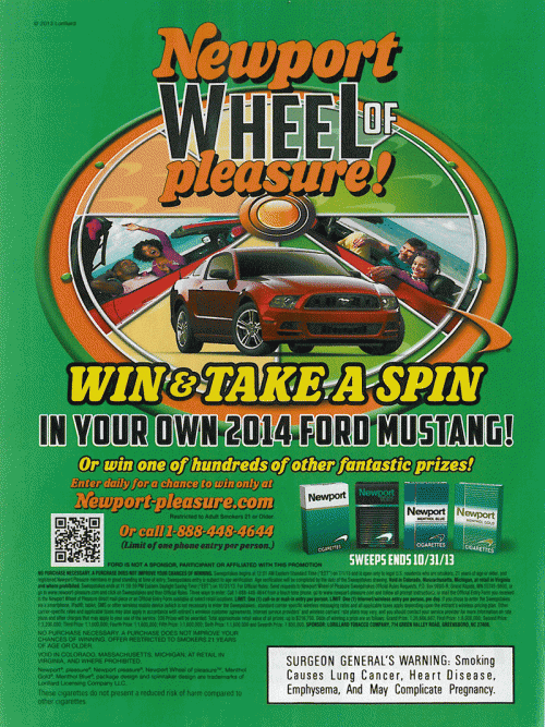 Newport ad promoting their "Wheel of Pleasure" sweepstakes. The ad features an image of a wheel with images of couples relaxing in a new car, as well as the grand prize: a 2014 Ford Mustang. The ad also invites the reader to win one of hundreds of other prizes, and to enter the sweeps either online or by phone. Text: "Win & Take a Spin in your own 2014 Ford Mustang!"