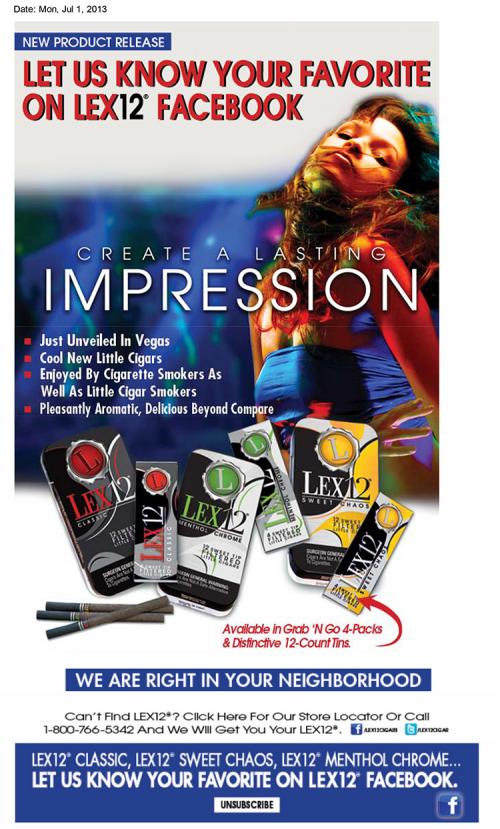 Email received from Lex12 promoting new Little Cigars. Email provides addresses of nearest locations that sell Lex12.