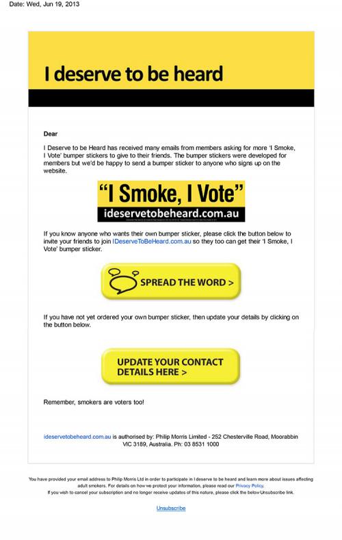 Email received from Philip Morris in July 2013 to receiver in Australia promoting the " I smoke, I vote" campaign. The email advocates to receiver to send the website IDeserveToBeHeard.com.au to fellow smokers. There is also a Spread The Word Tab which allows the receiver to type in email addresses of their friends to send them a link directly to their email.