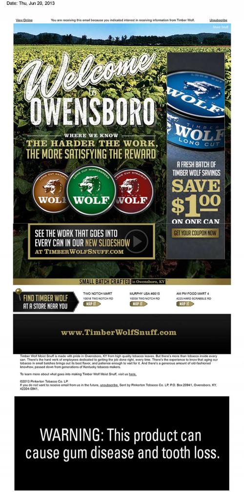 Timber Wolf email received in July 2013 with a link to the website for a coupon. Text: " Welcome to Owensboro Where We Know The Harder The Work The More Satisfying The Reward"