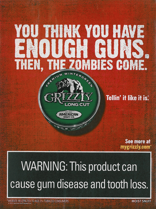 Tellin' it like it is Grizzly ad promoting their Premium Wintergreen, Long Cut product. Text: "You think you have enough guns. Then, the zombies come."