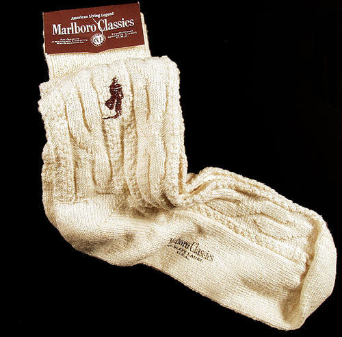 Cream socks with embroidered Marlboro man in brown "Marlboro classics - American living legend" on tag. Printed on bottom of sock.