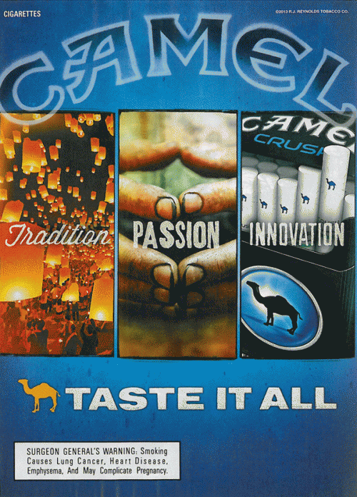 Camel ad featuring several images from its Summer 2013 ad series. Text: "Tradition; Passion; Innovation. Taste it all."