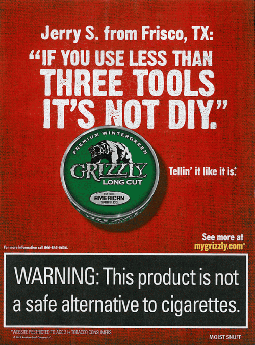 "Tellin' it like it is" Grizzly ad promoting their Premium Wintergreen Long Cut product. Text: "Jerry S. from Frisco, TX: 'If you use less than three tools it's not DIY."