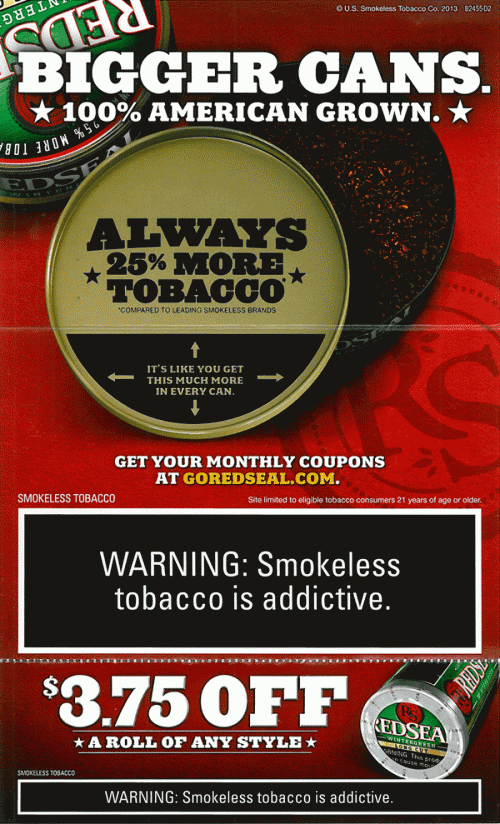 Direct mail received from Red Seal highlighting the brands bigger cans with 25% more tobacco than leading smokeless brands. The piece includes a coupon and invites the receiver to get monthly coupons at Goredseal.com.