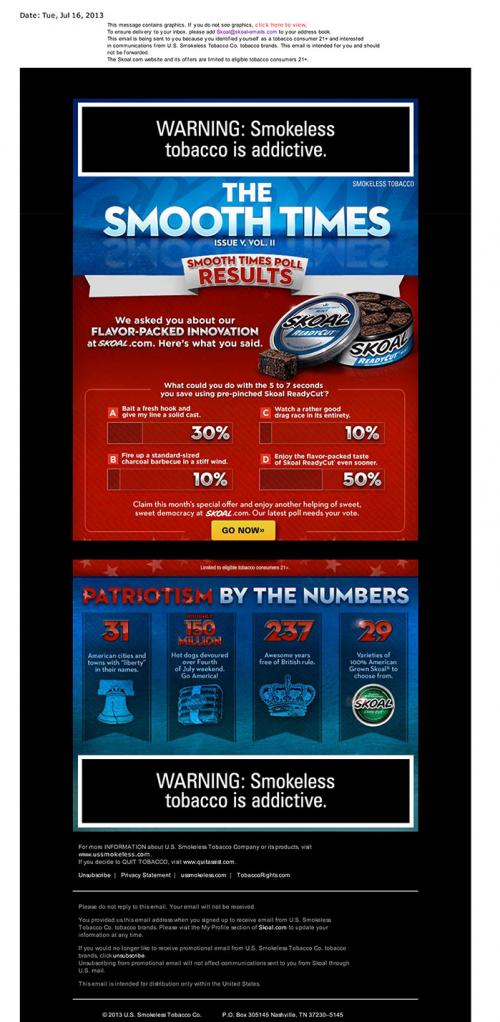 Email from Skoal sent in July 2013 as an issue of "The Smooth Times", Skoal's electronic newsletter. The email has a patriotic theme where it discusses patriotic facts by the numbers as well as poll results about what other activities Skoal users can do with the time Skoal ReadyCut can save them. It also, directs the receiver to the brand website to receive this month's special offer.