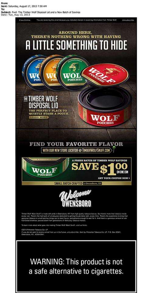 Email received in August 2013 from Timberwolf promoting their disposable lid product line as well