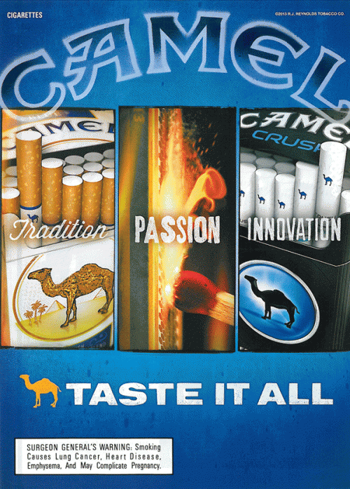 Camel ad featuring several images from its Summer 2013 ad series. Text: "Tradition. Passion. Innovation. Taste It All."