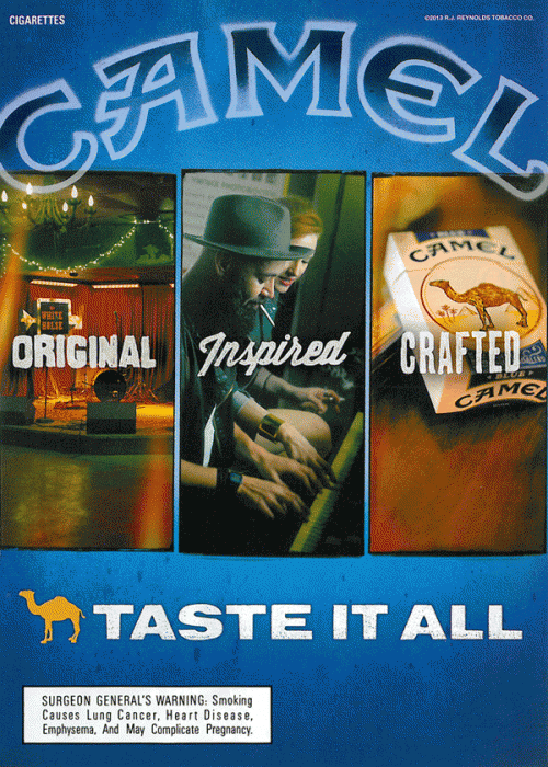 Camel ad featuring several images from its Summer 2013 ad series. Text: "Original. Inspired. Crafted. Taste It All."