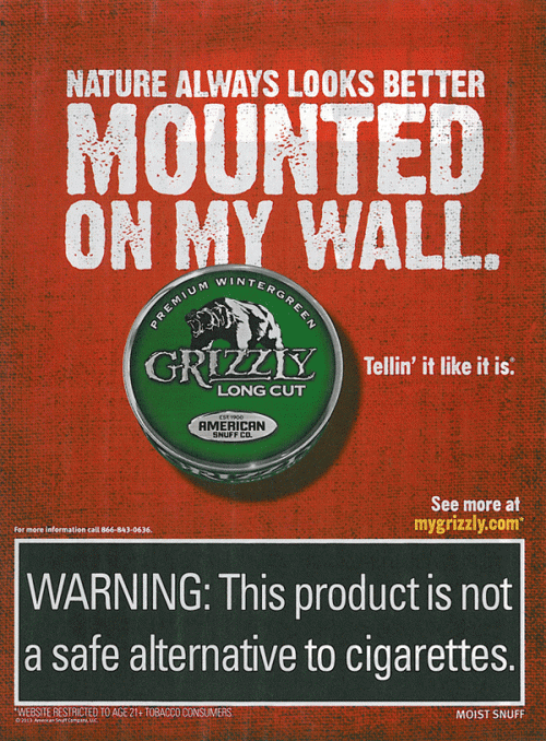 "Tellin' it like it is" Grizzly ad promoting their Premium Wintergreen, Long Cut product. Text: "Nature always looks better mounted on my wall."