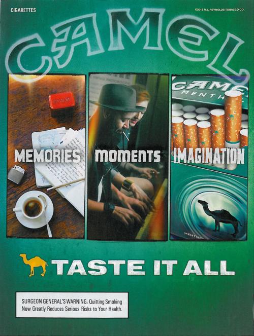 Full page Camel ad featuring several different images. This Camel ad includes a new image of Camel menthol, that has not been included in past Camel advertisements. Text: "Memories. Moments. Imagination. Taste It All."