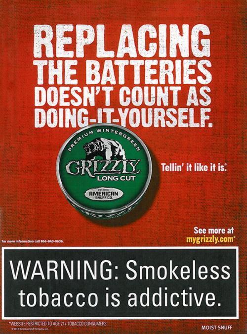 Grizzly ad from its Tellin' it like it is campaign that is promoting their long cut wintergreen product. Text: "Replacing the batteries doesn't count as doing-it-yourself."