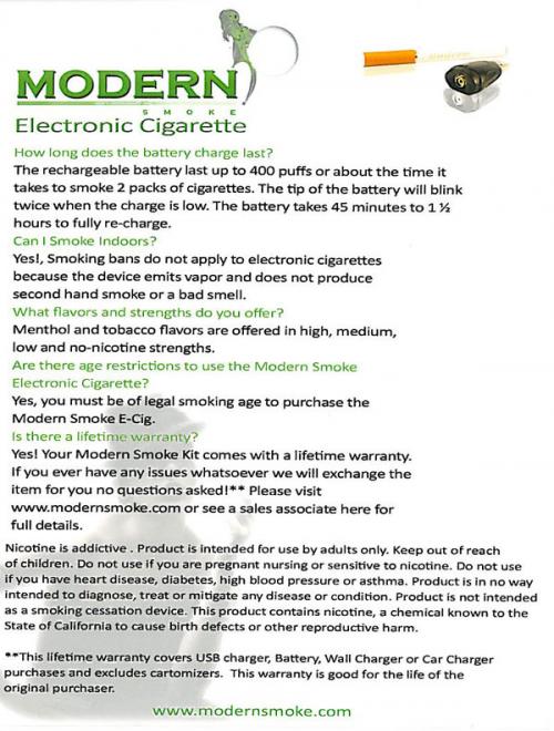 A promotional postcard received in August 2013 promoting Modern Smoke Electronic Cigarettes. The postcard provides information on how long the battery charge lasts, available flavors and how much money the recipient will save in using a Modern Smoke e-cigarette versus a traditional cigarette smoker. The postcard also encourages the recipient to bring this card to the register to get a discount on the modern smoke e-cigarette.