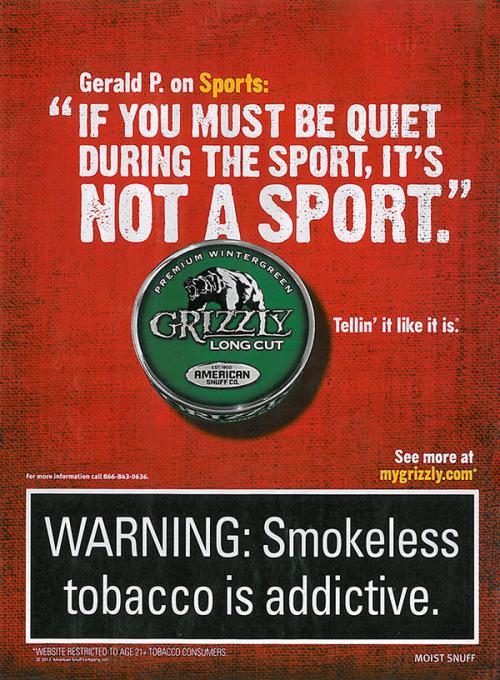 Magazine ad for Grizzly advertising their Premium Wintergreen Long Cut product. Text: "If you must be quiet during the sport, it's not a sport." From the "Tellin' it like it is" campaign.