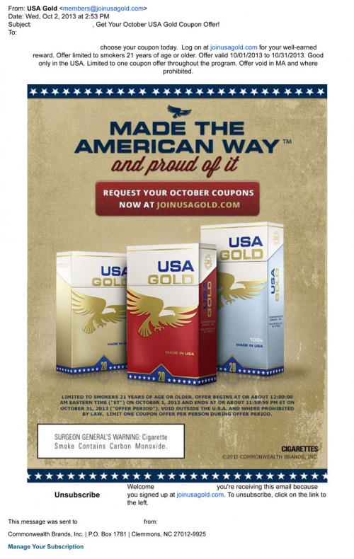 Email received from USA Gold in October 2013 inviting the receiver to go to the brand website and request this month's coupons. Text: "Made the American Way and proud of it."