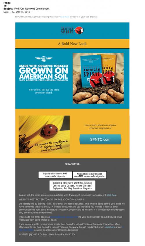 Email received from American Spirit in October 2013 that is promoting the new look of their cigarette cartons as well as providing a website address for more information on their tobacco