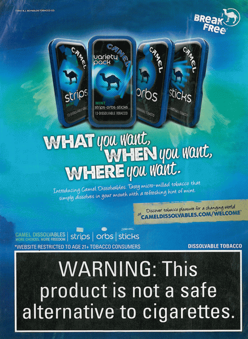 Ad from Camel Dissolvables promoting strips, orbs, and sticks. The ad features images of all products including a variety pack, and invites the reader to Cameldissolvables.com to "discover tobacco pleasure for a changing world." Text: "What you want, when you want, where you want."