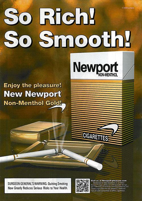 Newport Magazine ad promoting their "New Newport Non-Menthol Gold" cigarettes. Ad features a pack of Newport non-menthol cigarettes in gold and white packaging. Ad also features a gold lighter, gold ash tray, as well as two lit and burning cigarettes.