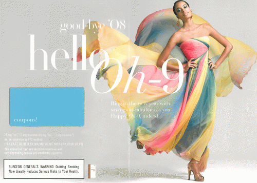 Direct mail piece from Virginia Slims celebrating New Year's 2009 by delivering a packet of coupons to the receiver. The piece features an image of a model in a colorful dress. Text: "good-bye '08 hello Oh-9. Ring in the new year with savings as fabulous as you. Happy Oh-9, indeed."