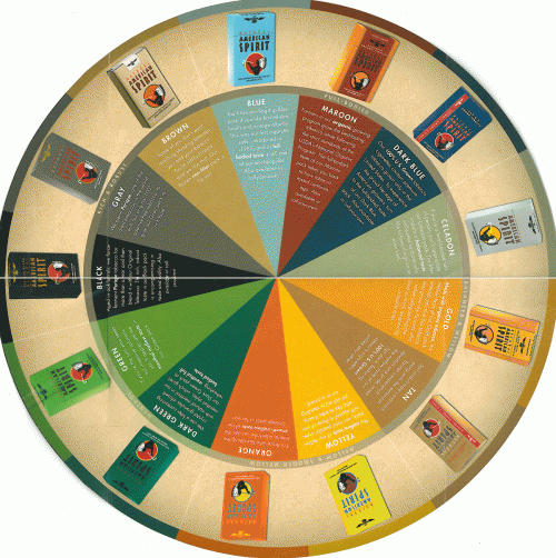 Direct mail from American Spirit. The piece opens up to reveal product and company information, and opens up further into a large diagram of all styles. A friendly letter with a store locator, and coupons are also included. Text: \"A style for every taste.\"