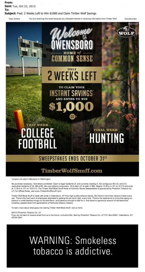 Timber Wolf email received in October 2013 announcing that there is only 2 weeks left in their Home of Common Sense sweepstakes, where the recipient can be entered to win $1,000.
