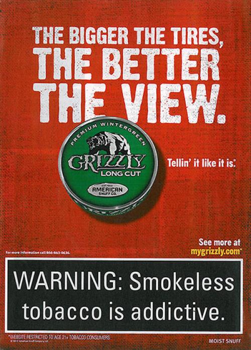 "Tellin' it like it is" magazine ad from Grizzly promoting their premium wintergreen long cut product. Text: "The bigger the tires, the better the view."