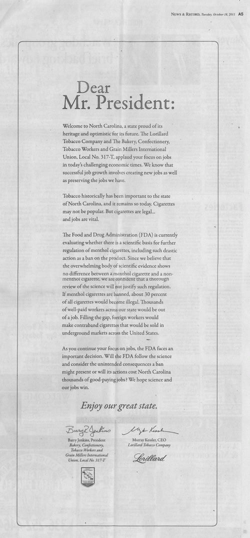 Newspaper ad from North Carolina addressing the President of the United States, applauding his leadership, and explaining the economic consequences of banning menthol cigarettes, particularly in North Carolina. The "letter" is signed by President of the Bakery, Confectionery, Tobacco Workers and Grain Millers International Union; and the CEO of Lorillard Tobacco Company.