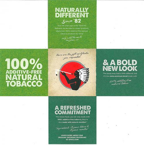 Direct mail, multi-fold piece from American Spirit received in November 2013 sending the receiver the coupons requested from the website. Piece is light and dark greens featuring two kinds of American Spirit menthol packs. Other text "Naturally Different since '82," "100 Additive-Free Natural Tobacco," "A Refreshed Commitment," and "Natural Menthol." Both coupons are for 1 pack for $1 and feature a hologram. The coupons are void if the hologram is not attached.