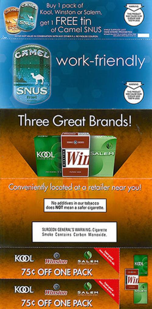 Direct mail joint promotion received in August 2009 from RJ Reynolds and Wawa for Kool, Winston, and Salem cigarettes as well as Camel Snus. The piece promotes Camel Snus as a work-friendly product and includes a coupon for a free tin when purchasing a pack Kool, Winston, or Salem cigarettes. The direct mail piece also includes two 75 cent off one pack of Kool, Winston, or Salem that are good at all participating Wawa locations.