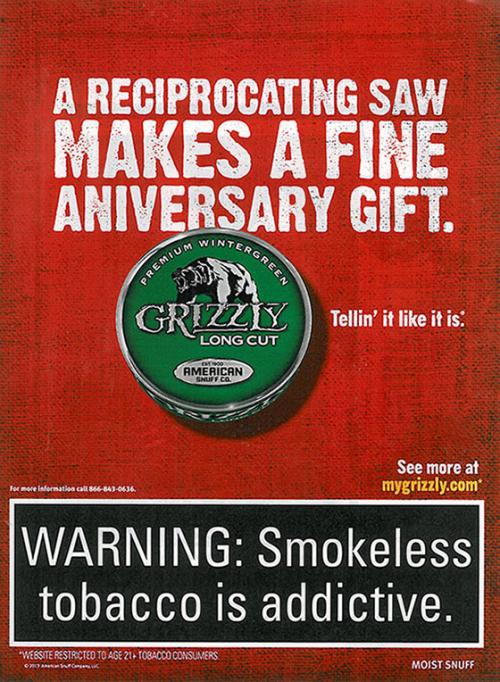 "Tellin' it like it is" ad from Grizzly promoting their Premium Wintergreen Long Cut product. Text: "A reciprocating saw makes a fine anniversary gift."