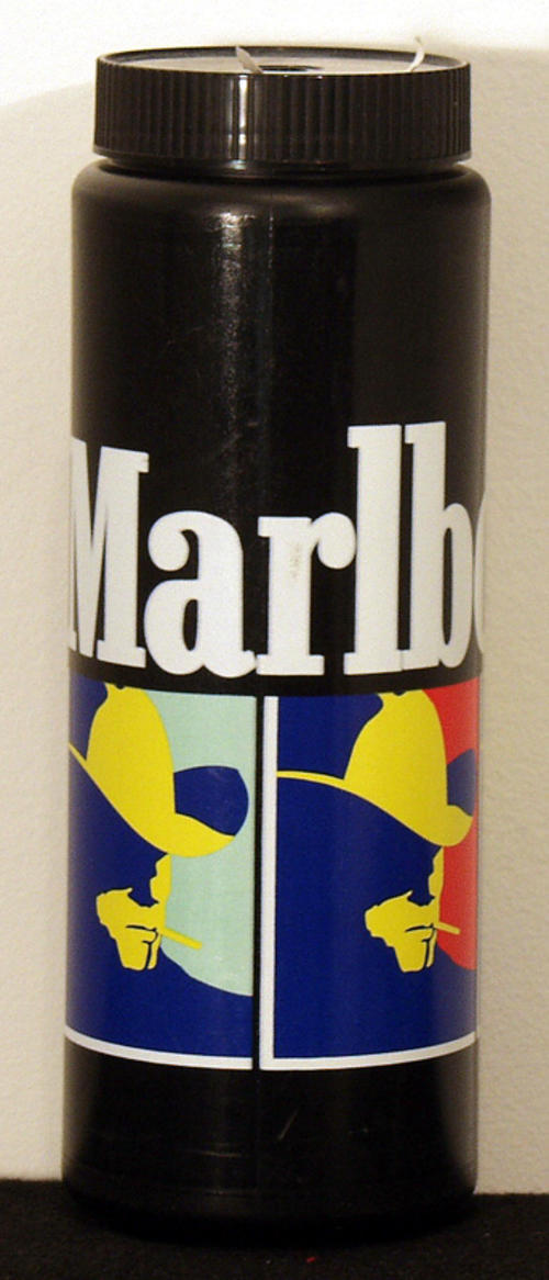 Black plastic Water bottle with "Marlboro" written in white with 3 pictures of Marlboro man.