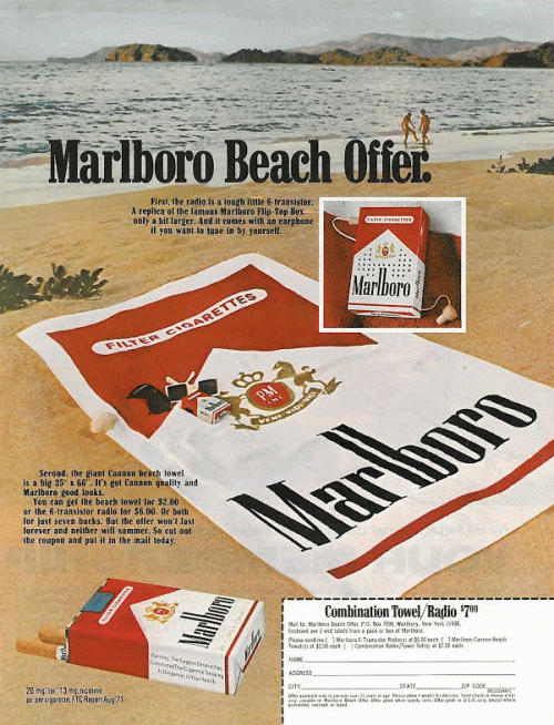 Marlboro ad featuring images and descriptions of promotional items (6-transistor radio, and beach towel), including the prices and an order form. Text: "Marlboro Beach Offer."