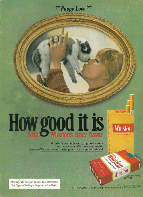 Ad from Winston featuring an image of a woman kissing a puppy, and the product itself. Text: "How good it is with Winston's finer flavor."