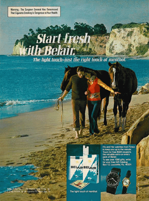 Ad from Belair featuring an image of a man and woman walking along the beach with two horses in tow. The ad also encourages the reader to write in for a gift catalog and offers his and her Timex watches with B&W coupons. Text: Start fresh with Belair."