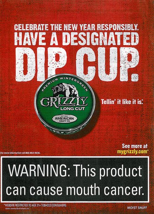 Magazine ad from Grizzly's 'Tellin' it like it is' advertisement series promoting their Premium Wintergreen Long Cut product.  The ad is New Year themed with text: "Celebrate the New Year responsibly. Have a designated dip cup."