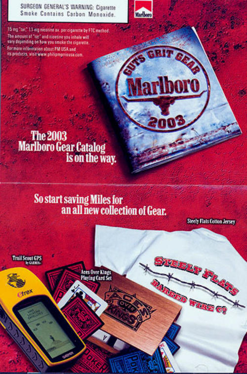 Marlboro direct mail. "Keep a look out." Cowboy Miles campaign 2003. "The 2003 Marlboro Gear Catalog is on the way - so start saving miles for an all new collection of gear."