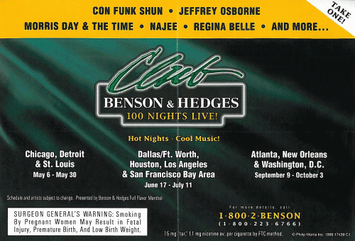 Promotional card by Benson & Hedges promoting "Club Benson & Hedges 100 Nights Live," a series of musical events in 10 U.S. cities sponsored by the company. This particular card provides the New Orleans schedule, and provides a phone number for more information, as well as club contacts.