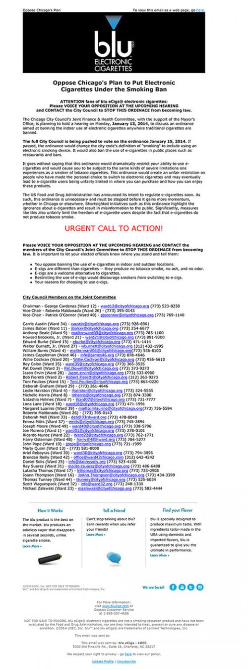 Email received from Blu on January 10, 2014 with subject: "Oppose Plan to Put Electronic Cigarettes Under the Smoking Ban."  Chicago City Council's Joint Finance & Health Committee is planning to hold a hearing on January 13, 2014 to discuss an ordinance aimed at banning the indoor use of electronic cigarettes anywhere traditional cigarettes are banned. The email asks to receiver to voice their opposition at the upcoming hearing in Chicago and contact the city council to make the ordinance a law. The email lists contacts in the city council and joint committee for the receiver to contact.