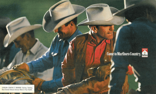 Ad by Marlboro featuring an image of cowboys in nature conversing with one another. Text: "Come to Marlboro Country."