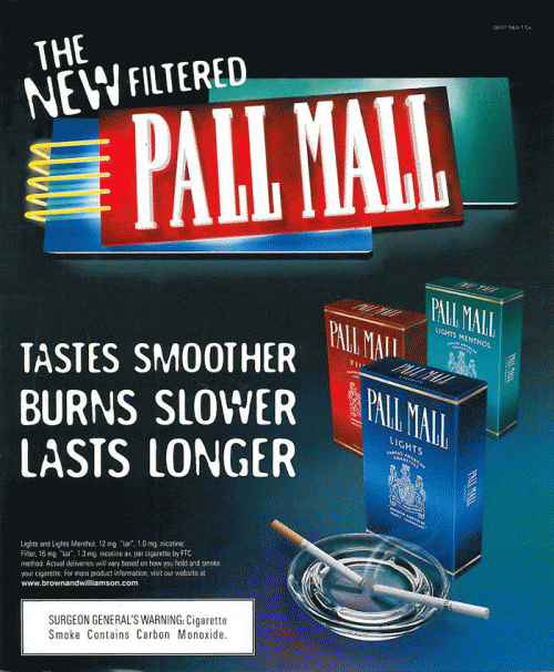 Ad by Pall Mall advertising their new filtered cigarettes with images of the product. Text: "The new filtered Pall Mall. Tastes smoother; burns slower; lasts longer."