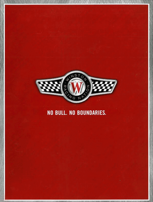 Multi-page insert by Winston promoting their "Winston Racing Nation" club. This small insert/booklet features black and white images of people at racing events with different captions above and to the side of the photos. The ad encourages the reader to join by calling a toll-free number and showcasing prizes and special offers available to members. Text: "No Bull. No Boundaries."
