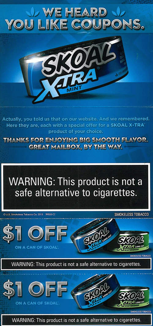 Direct mail from Skoal delivering coupons and promoting their X-tra Mint product. Text: \"We heard you like coupons.\"